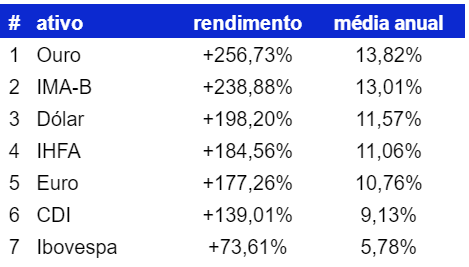 Antes mostrarei um dado da exame invest sobre o rendimento de alguns ativos nos últimos 10 anos (de 2011 a 2020):
