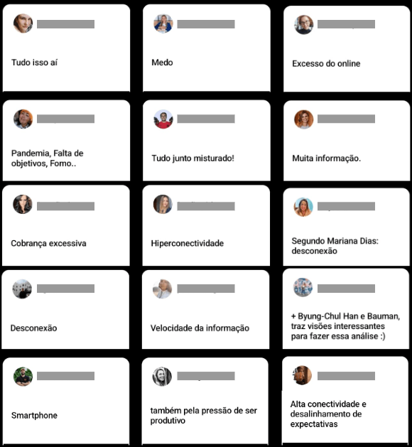 As respostas giraram em torno da tecnologia (redes sociais, smartphones, hiper conectividade) e também dos excessos (informação, noticias, expectativas, medos, comparações).