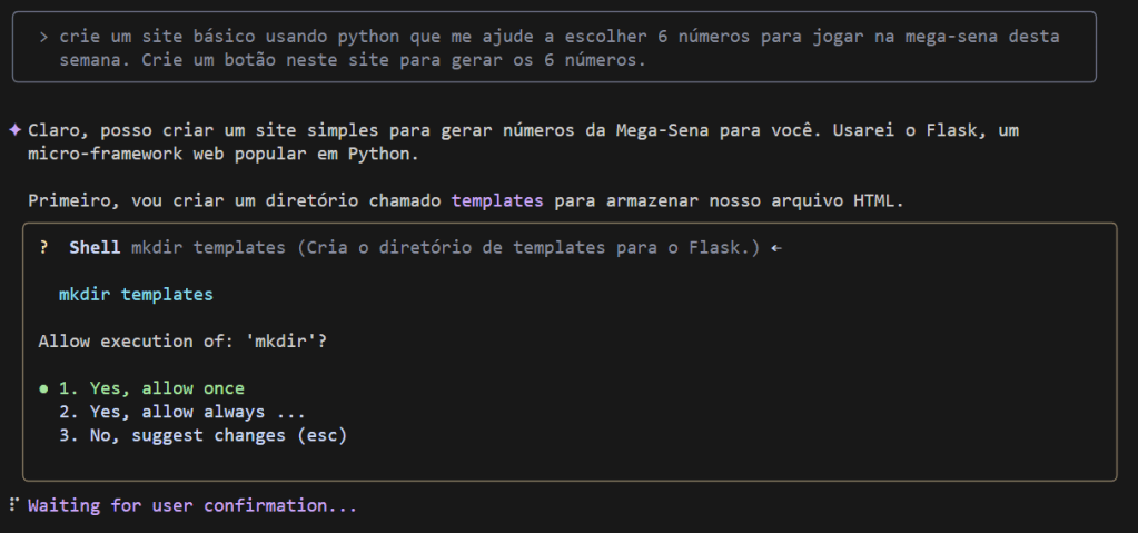 Agora, dentro do seu terminal, você pode pedir para o Gemini criar seu primeiro código para você.