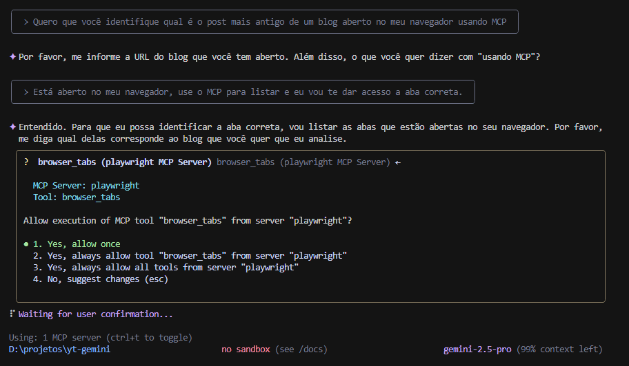 Depois de fazer o setup, logo que inicializar o gemini, a mensagem incial já vai alertar um MCP disponível.
