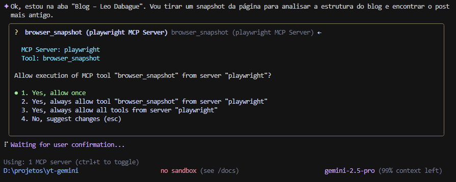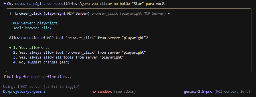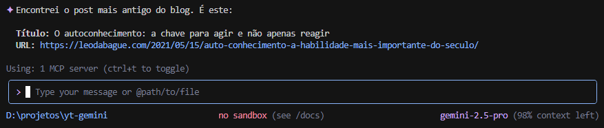 ⚠️ E se já tiver com o gemini carregado, você vai precisar dar um /quit. Obs: eu sei que existe um /mcp refresh, mas em todos os meus testes, só carrega o mcp se você você inicializar o gemini depois de fazer o setup.