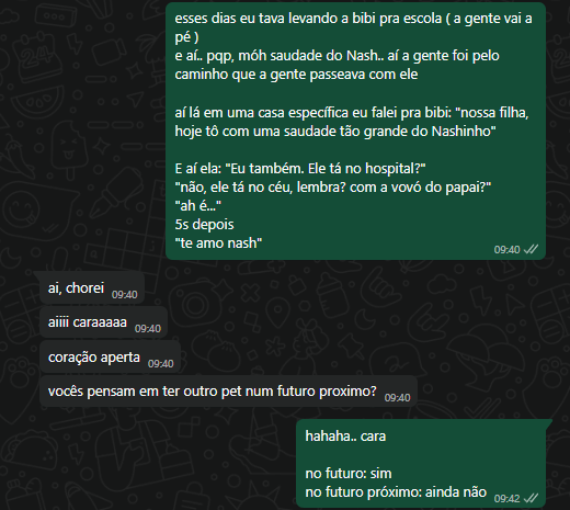 Mas.. vendo as fotos e lembrando do que vivemos juntos.. O Nash mudou a minha vida. Mudou a vida da minha esposa, da minha filha, da creche que ele ia, das pessoas que davam banho nele, dos meus sogros, pais, sobrinhas.. e talvez de tantas pessoas que nem sei.